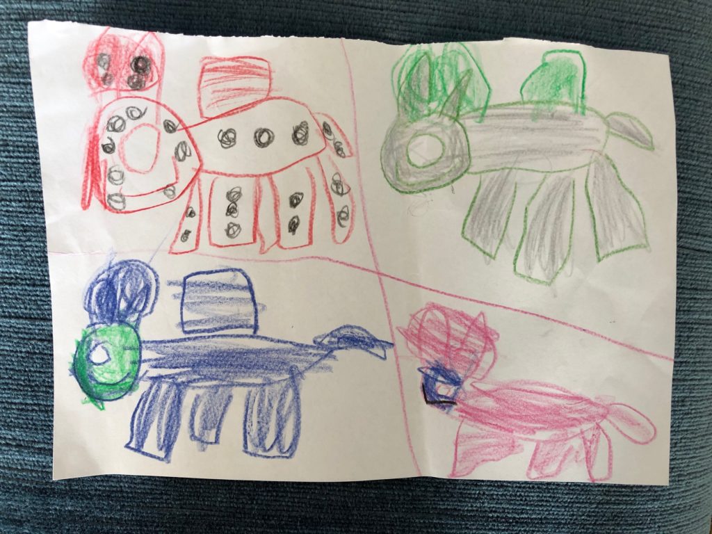 Veröffentlicht am September 21, 2020September 21, 2020Paw Patrol lo: Marshall, ro: Rocky, lu: Chase, ru: Skye Paw Patrol gezeichnet im Kindergarten im Sept. 2020
